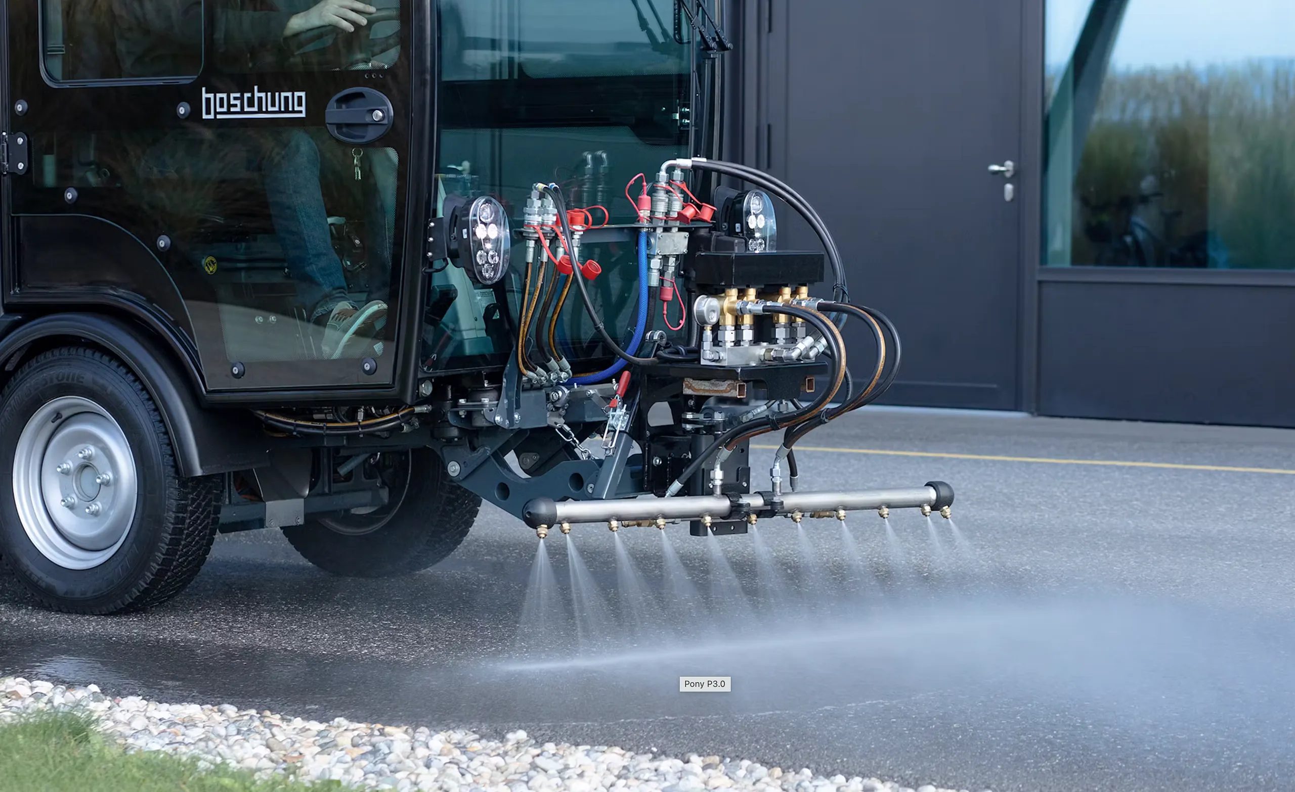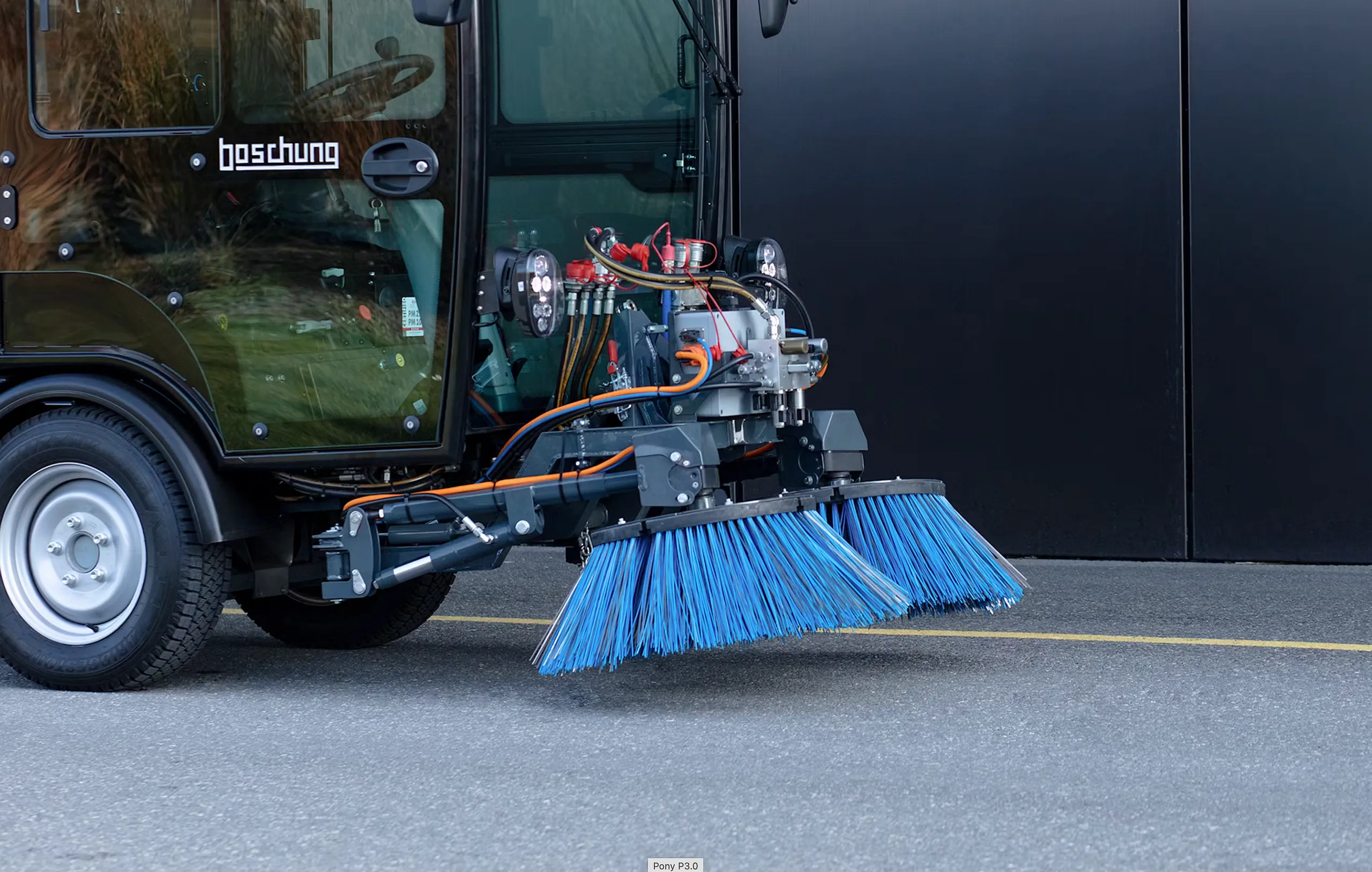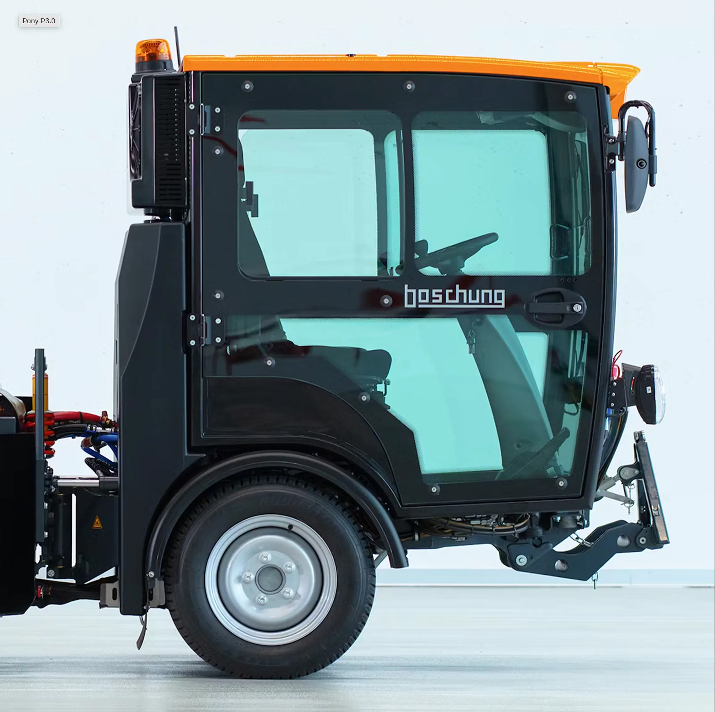 Boschung Pony P 3.0 MAX er en allsidig og kompakt maskin utviklet for profesjonell bruk året rundt. Den kan tilpasses en rekke ulike oppgaver – fra feiing og snørydding til saltspredning og høytrykksvask – og kombinerer kraft, presisjon og fleksibilitet i et robust og kompakt format.