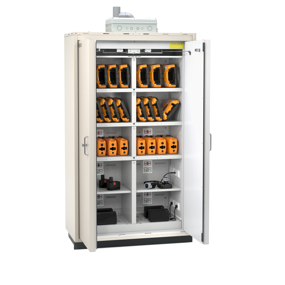 Ladeskapet kombinerer sikkerhet og funksjonalitet. Her kan Pellenc-batteriene dine lades i et temperaturkontrollert og brannisolert miljø som reduserer risikoen for overoppheting og brann. Hver ladeplass er individuelt sikret, og skapet kan leveres med uttrekkshyller og kontaktpaneler som gir enkel tilgang og oversiktlig organisering av batteriene dine.